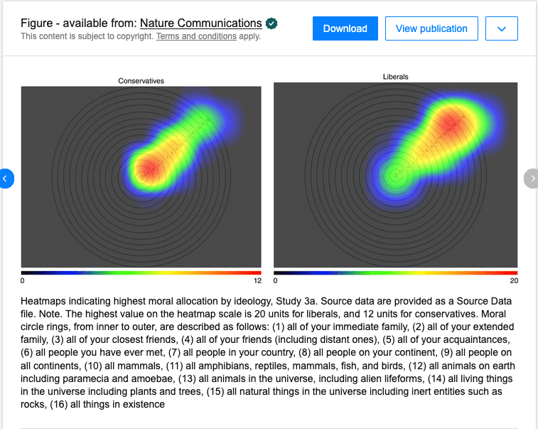 The dog whistle here is “the Left are so psychotic, they don’t even love their families”. This is a blatant misreading and mischaracterizing of the study and its findings, and they know that. It says “the Right values in-group connections and don’t value larger, more plural ones”. It says “the Left values larger, more pluralist and universalist connections over smaller, more individualized ones.”